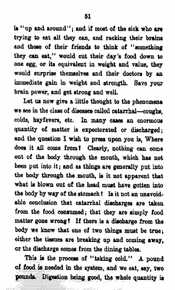 Let us now give a little thought to the phenomena we see in the class of diseases called catarrhal --- coughs, colds, hayfevers, etc. In many cases an enormous quantity of matter is expectorated or discharged; and the question I wish to press upon you is, Where does it all come from? Clearly, nothing can come out of the body through the mouth, which has not been put into it; and as things are generally put into the body through the mouth, is it not apparent that what is blown out of the head must have gotten into the body by way of the stomach? Is it not an unavoidable conclusion that catarrhal discharges are taken from the food consumed; that they are simply food matter gone wrong? If there is a discharge from the body we know that one of two things must be true; either the tissues are breaking up and coming away, or the discharge comes from the dining tables.