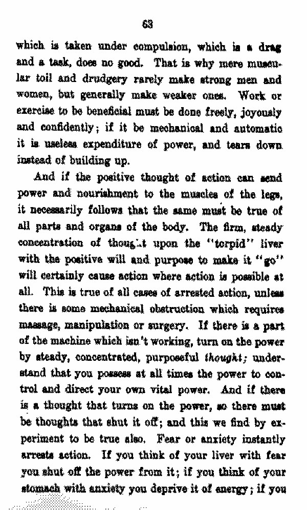 And if the positive thought of action can send power and nourishment to the muscles of the legs, it necessarily follows that the same must be true of all parts and organs of the body. The firm, steady concentration of thought upon the "torpid" liver with the positive will and purpose to make it "go" will certainly cause action where action is possible at all. This is true of all cases of arrested action, unless there is some mechanical obstruction which requires massage, manipulation or surgery. if there is a part of the machine which isn't working, turn on the power by steady, concentrated, purposeful thought; understand that you possess at all times the power to control and direct your own vital power. And if there is a thought that turns on the power, so there must be thoughts that shut it off; and this we find by experiment to be true also. Fear or anxiety instantly arrests action. if you think of your liver with fear you off the power from it; if you think of your stomach with anxiety you deprive it of energy; if you