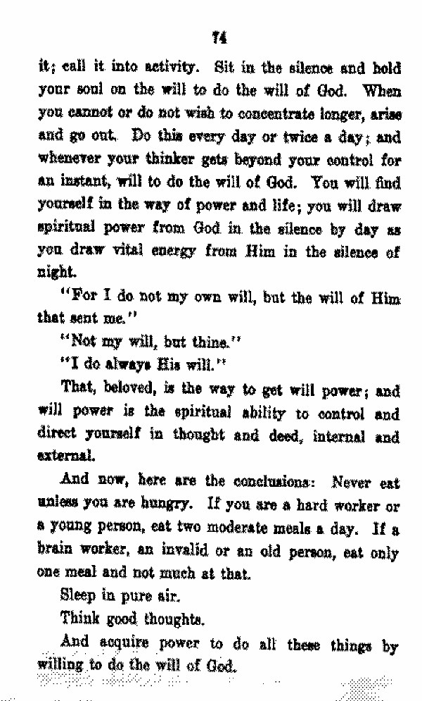 it; call it into activity. Sit in the silence and hold your soul on the will to do the will of God. When you cannot or do not wish to concentrate longer, arise and go out. Do this every day or twice a day; and whenever your thinker gets beyond your control for an instant, will to do the will of God. You will, find yourself in the way of power and life; you will draw spiritual power from God in the silence by day as you draw vital energy from Him in the silence of night.