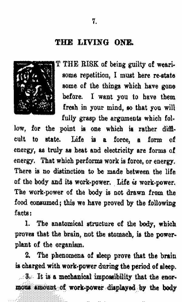 AT THE RISK of being guilty of wearisome repetition, I must here re-state some of the things. which have gone, before. I want you to, have them. fresh in your mind, so that you will fully grasp the arguments which follow for the point is one which is rather difficult to state. Life is a force, a form of energy, as truly as heat and electricity are forms of energy. That which performs work is force, or energy. There is no distinction to be made between the life of the body and its work-power. Life is work-power, The work-power of the body is most drawn from the food consumed; this we have proved by the following facts: