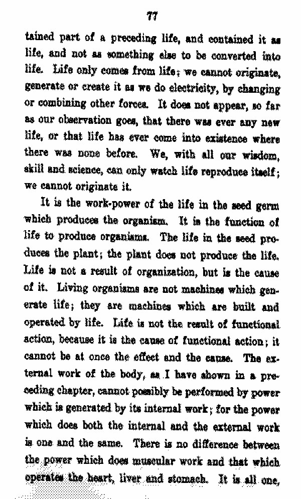 It is the work-power of the life in the seed germ which produces the organism it is the function of life to produce organisms. The life in the seed produces the plant; the plant does not produce the life. Life is not a result of organization, but is the cause of it. Living organisms are not machines which generate life; they are machines which are built and operated by life. Life is not the result of functional. action, because it is the cause of functional action; it cannot be at once the effect and the cause. The external work of the body, as i have shown in a preceding chapter, cannot possibly be performed by power which is generated by its internal work; for the power which does both the internal and the external work is one and the same. There is no difference between the power which does muscular work and that which operates the heart, liver and stomach. It is all one,