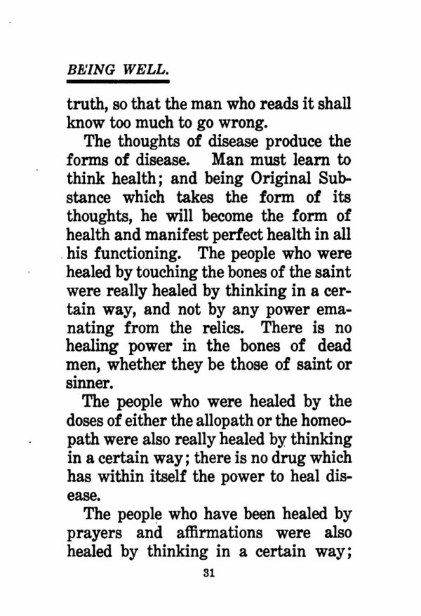 The thoughts of disease produce the forms of disease. Man must learn to think health; and being Original Substance which takes the form of its thoughts, he will become the form of health and manifest perfect health in all his functioning. The people who were healed by touching the bones of the saint were really healed by thinking in a certain way, and not by any power emanating from the relics. There is no healing power in the bones of dead men, whether they be those of saint or sinner.