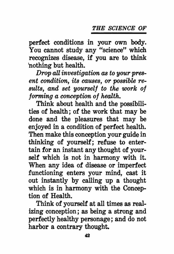 perfect conditions in your own body. You cannot study any "science" which recognizes disease, if you are to think 'nothing but health.