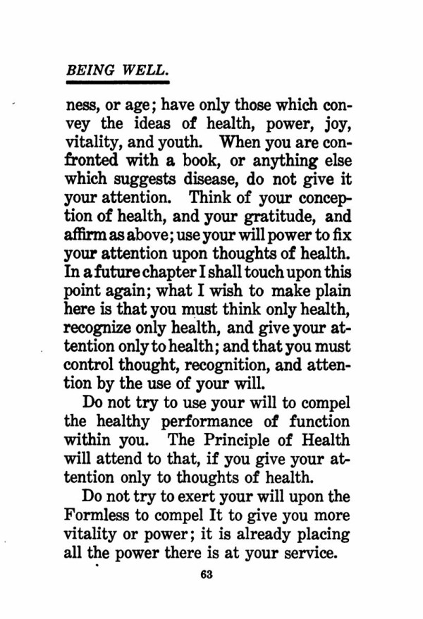 or age; have only those which convey the ideas of health, power, joy, vitality, and youth. When you are confronted with a book, or anything else which suggests disease, do not give it your attention. Think of your conception of health, and your gratitude, and affirm as above; use your will power to fix your attention upon thoughts of health.