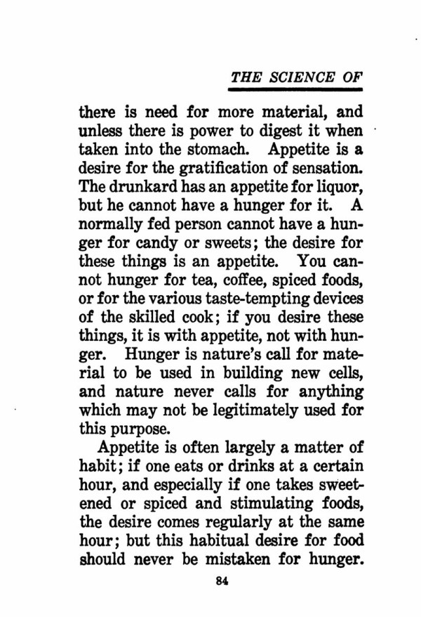 there is need for more material, and unless there is power to digest it when taken into the stomach. Appetite is a desire for the gratification of sensation. The drunkard has an appetite for liquor, but he cannot have a hunger for it. A normally fed person cannot have a hunger for candy or sweets; the desire for these things is an appetite. You cannot hunger for tea, coffee, spiced foods, or for the various taste-tempting devices of the skilled cook; if you desire these things, it is with appetite, not with hunger. Hunger is nature's call for material to be used in building new cells, and nature never calls for anything which may not be legitimately used for this purpose.