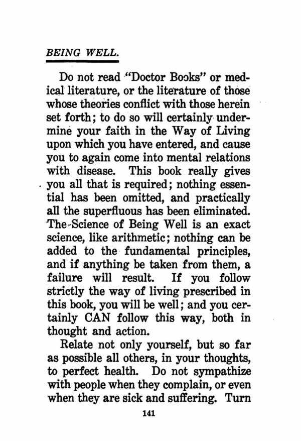 The Science of Being Well is an exact science, like arithmetic; nothing can be added to the fundamental principles, and if anything be taken from them, a failure will result. If you follow strictly the way of living prescribed in this book, you will be well; and you certainly CAN follow this way, both in thought and action.