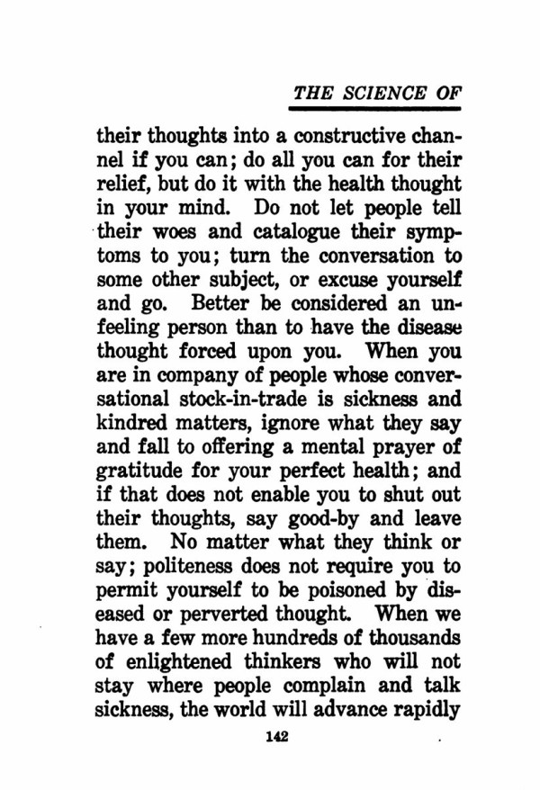 their thoughts into a constructive channel if you can; do all you can for their relief, but do it with the health thought in your mind. Do not let people tell their woes and catalogue their symptoms to you; turn the conversation to some other subject, or excuse yourself and go. Better be considered an unfeeling person than to have the disease thought forced upon you. When you are in company of people whose conversational stock-in-trade is sickness and kindred matters, ignore what they say and fall to offering a mental prayer of gratitude for your perfect health; and if that does not enable you to shut out their thoughts, say good-by and leave them. No matter what they think or say; politeness does not require you to permit yourself to be poisoned by diseased or perverted thought When we have a few more hundreds of thousands of enlightened thinkers who will not stay where people complain and talk sickness, the world will advance rapidly