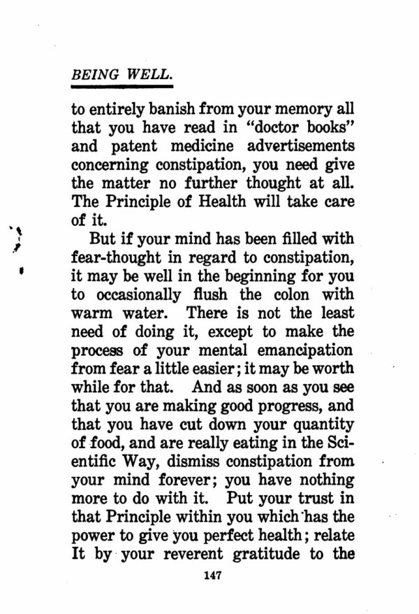 But if your mind has been filled with fear-thought in regard to constipation, it may be well in the beginning for you to occasionally flush the colon with warm water. There is not the least need of doing it, except to make the process of your mental emancipation from fear a little easier; it may be worth while for that. And as soon as you see that you are making good progress, and that you have cut down your quantity of food, and are really eating in the Scientific Way, dismiss constipation from your mind forever; you have nothing more to do with it. Put your trust in that Principle within you which has the power to give you perfect health; relate It by your reverent gratitude to the