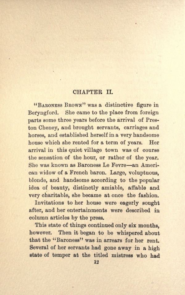 "BARONESS BROWN" was a distinctive figure in Beryngford. She came to the place from foreign parts some three years before the arrival of Preston Cheney, and brought servants, carriages and horses, and established herself in a very handsome house which she rented for a term of years. Her arrival in this quiet village town was of course the sensation of the hour, or rather of the year. She was known as Baroness Le Fevre' an American widow of a French baron. Large, voluptuous, blonde, and handsome according to the popular idea of beauty, distinctly amiable, affable and very charitable, she became at once the fashion.