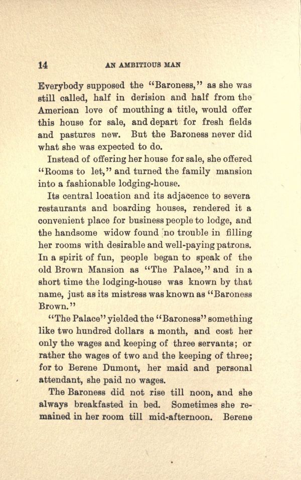 Its central location and its adjacence to several restaurants and boarding houses, rendered it a convenient place for business people to lodge, and, the handsome widow found no trouble in filling her rooms with desirable and well-paying patrons. In a spirit of fun, people began to speak of the old Brown Mansion as "The Palace," and in a short time the lodging-house was known by that name, just as its mistress was known as "Baroness Brown."