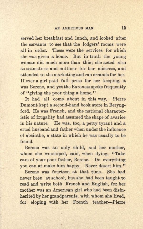served her breakfast and lunch, and looked after the servants to see that the lodgers' rooms were all in order. These were the services for which she was given a home. But in truth the young woman did much more than this; she acted also as seamstress and milliner for her mistress, and attended to the marketing and ran errands for her. If ever a girl paid full price for her keeping, it was Berene, and yet the Baroness spoke frequently of " giving the poor thing a home."