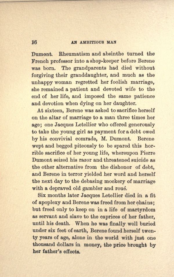 At sixteen, Berene was asked to sacrifice herself on the altar of marriage to a man three times her age; one Jacques Letellier who offered generously to take the young girl as payment for a debt owed by his convivial comrade, M. Dumont. Berene wept and begged piteously to be spared this horrible sacrifice of her young life, whereupon Pierre Dumont seized his razor and threatened suicide as the other alternative from the dishonor of debt, and Berene in terror yielded her word and herself the next day to the debasing mockery of marriage with a depraved old gambler and roue.
