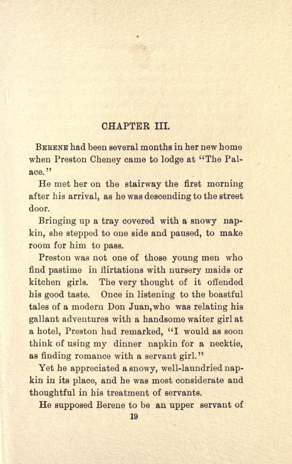BERENE had been several months in her new home when Preston Cheney came to lodge at "The Palace."