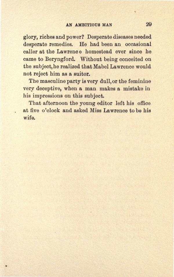 glory, riches and power? Desperate diseases needed desperate remedies. He had been an occasional caller at the Lawrence homestead ever Since he came to Beryngford. Without being conceited on the subject, he realized that Mabel Lawrence would not reject him as a suitor.