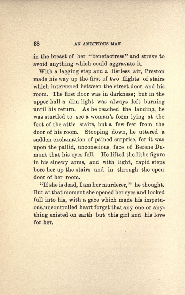 With a lagging step and a listless air, Preston made his way up the first of two flights of stairs which intervened between the street door and his room. The first floor was in darkness; but in the upper hall a dim light was always left 'burning until his return. As be reached the landing, be was startled to see a woman's form lying at the foot of the attic stairs, but a few feet from the door of his room. Stooping down, he uttered a sudden exclamation of pained surprise, for it was upon the pallid, unconscious face of Berene Dumont that his eyes fell. He lifted the lithe figure in his sinewy arms, and with light, rapid steps bore her up the stairs and in through the open door of her room.