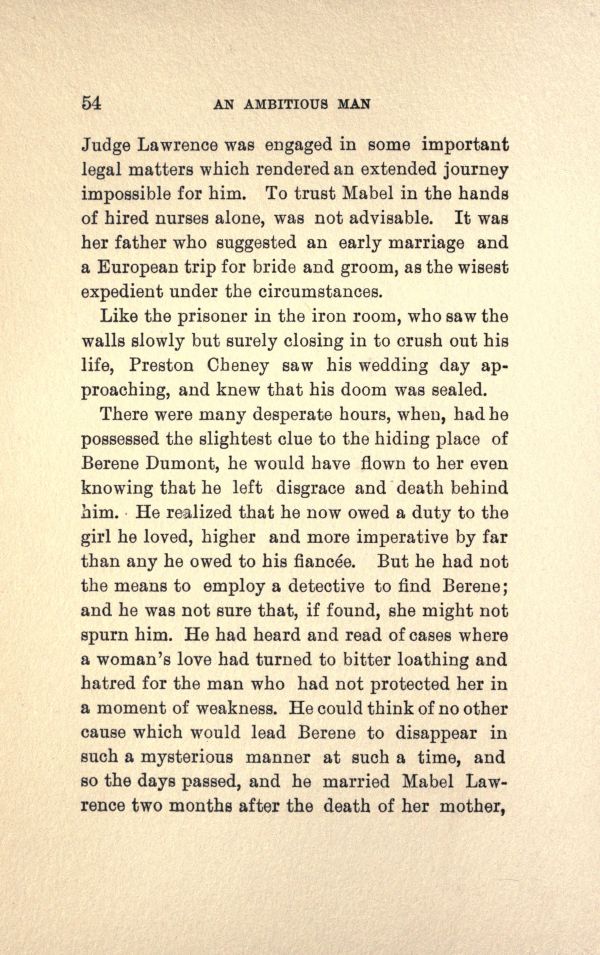 There were many desperate hours, when, had he possessed the slightest clue to the hiding place of Berene Dumont, he would have flow to her even knowing that be left disgrace and death behind him. He realized that he now owed duty to the girl he loved, higher and more imperative by far than any he owed to his fiancee. But he had not the means to employ a detective to find Berene; and he was not sure that, if found, she might not spurn him. He bad heard and read of cases where a woman's love had turned to bitter loathing and hatred for the man who had not protected her in a moment of weakness. He could think of no other cause which would lead Berene to disappear in such a mysterious manner at such time, and so the days passed, and be married Mabel Lawrence two months after the death of her mother,