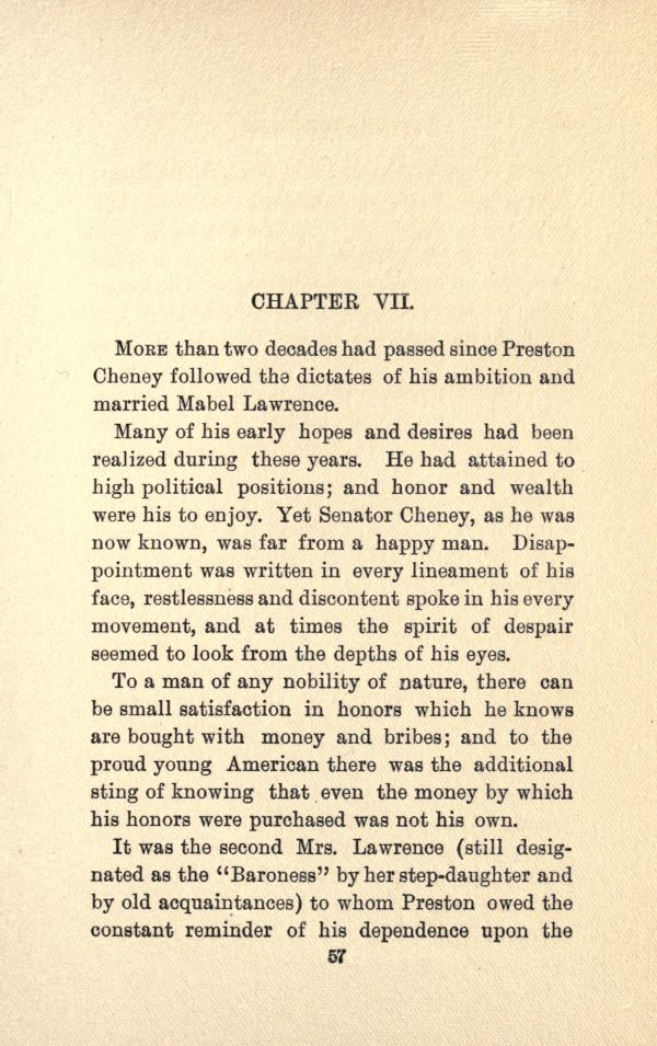 Many of his early hopes and desires had been realized during these years. He had attained to high political positions; and honor and wealth were his to enjoy Yet Senator Cheney, as he was now known, was far from a happy man. Disappointment was written in every lineament of his face, restlessness and discontent spoke in his every movement, and at times the spirit of despair seemed to look from the depths of his eyes.