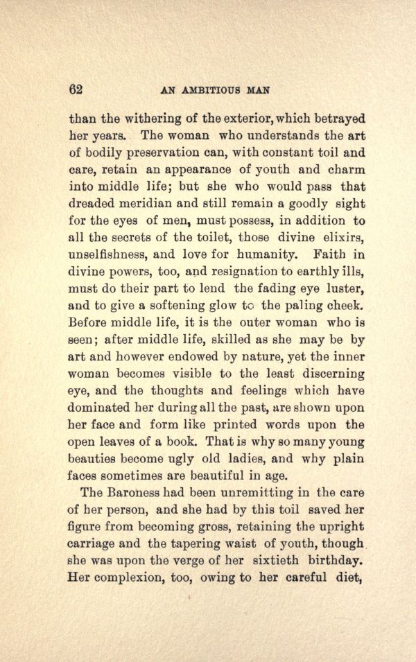 The Baroness had been unremitting in the care of her person, and she bad by this toil saved her figure from becoming gross, retaining the upright carriage and the tapering waist of youth, though she was upon the verge of her sixtieth birthday. Her complexion, too, owing to her careful diet,