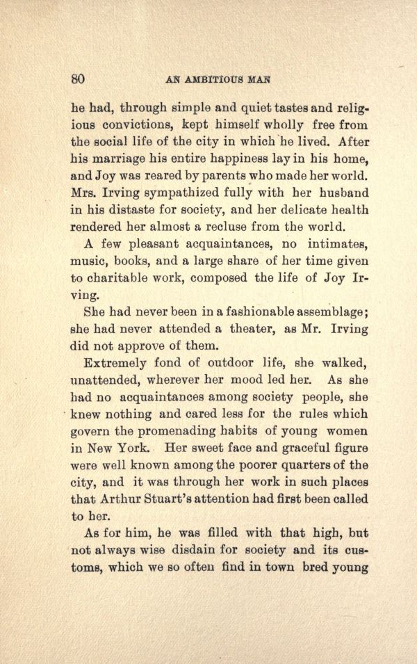 he had, through simple and quiet tastes and religious convictions, kept himself wholly free from the social life of the city in which he lived. After his marriage his entire happiness lay in his home, and Joy was reared by parents who made her world. Mrs. Irving sympathized fully with her husband in his distaste for society, and her delicate health rendered her almost a recluse from the world.