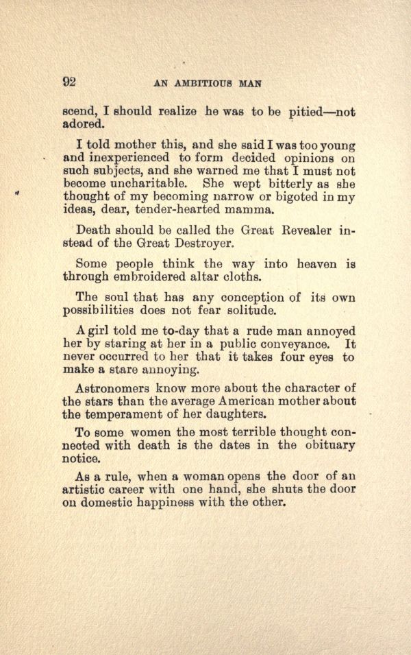 I told mother this, and she said I was too young and inexperienced to form decided Opinions on such subjects, and she warned me that I must not become uncharitable. She wept bitterly as she thought of my becoming narrow or bigoted in my ideas, dear, tender-hearted mamma.