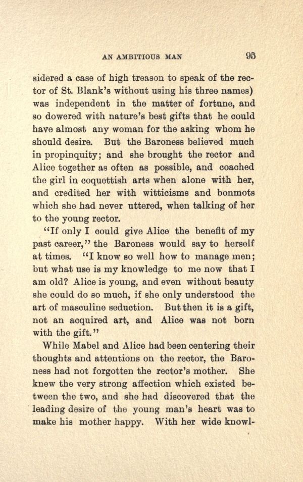 a case of high treason to speak of the rector of St. Blank's without using his three names) was independent in the matter of fortune, and so dowered with nature's best gifts that he could have almost any woman for the asking whom he should desire. But the Baroness believed much in propinquity; and she brought the rector and Alice together as often as possible, and coached the girl in coquettish arts when alone with her, and credited her with witticisms and bon mots which she bad never uttered, when talking of her to the young rector.