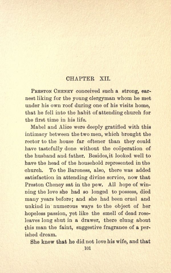 Mabel and Alice were deeply gratified with this intimacy between the two men, which brought the rector to the house far oftener than they could have tastefully done without the cooperation of the husband and father. Besides, it looked well to have the head of the household represented in the church. To the Baroness, also, there was added satisfaction in attending divine service, now that Preston Cheney sat in the pew. All hope of winning the love she had so longed to possess, died many years before; and she had been cruel and unkind in numerous ways to the object of her hopeless passion, yet like the smell of dead rose leaves long shut in a drawer, there clung about this man the faint, suggestive fragrance of a perished dream.