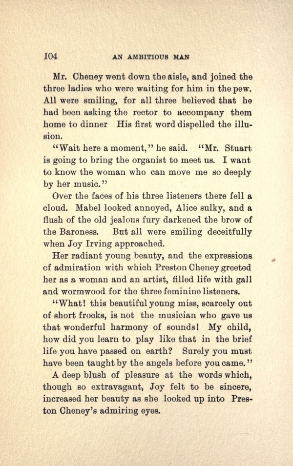 "What I this beautiful young miss, scarcely out of short frocks, is not the musician who gave us that wonderful harmony of sounds! My child, how did you learn to play like that in the brief life you have passed on earth? Surely you must have been taught by the angels before you came." A deep blush of pleasure at the words which, though so extravagant, Joy felt to be Sincere, increased her beauty as she looked up into Preston Cheney's admiring eyes.