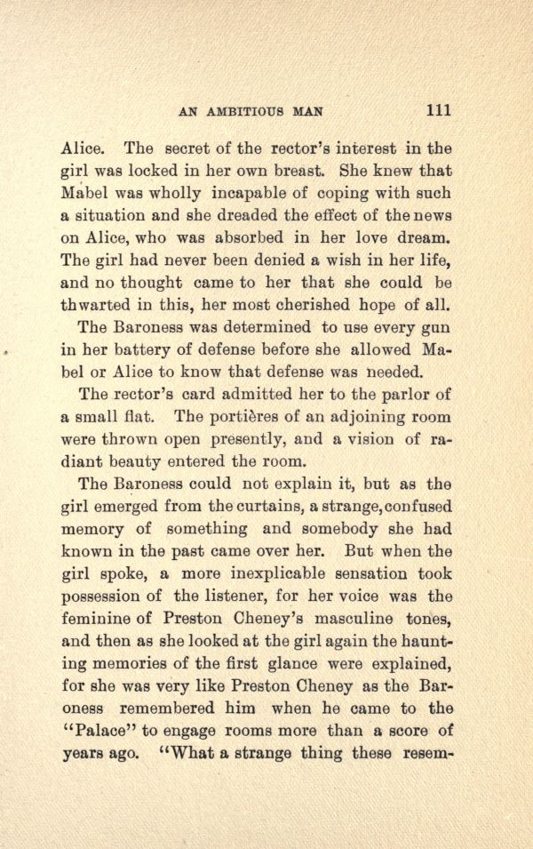 The Baroness could not explain it, but as the girl emerged from the curtains, a strange, confused memory of something and somebody she had known in the past came over her. But when the girl spoke, a more inexplicable sensation took possession of the listener, for her voice was the feminine of Preston Cheney's masculine tones, and then as she looked at the girl again the haunting memories of the first glance were explained, for she was very like Preston Cheney as the Baroness remembered him when he came to the " Palace" to engage rooms more than a score of years ago. "What a strange thing these resemblances
