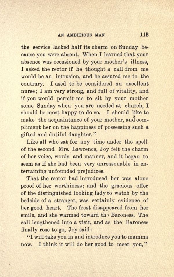 That the rector had introduced her was alone proof of her worthiness; and the gracious offer of the distinguished looking lady to watch by the bedside of a stranger, was certainly evidence of her good heart. The frost disappeared from her smile, and she warmed toward the Baroness. The call lengthened into a visit, and as the Baroness finally rose to go, Joy said: