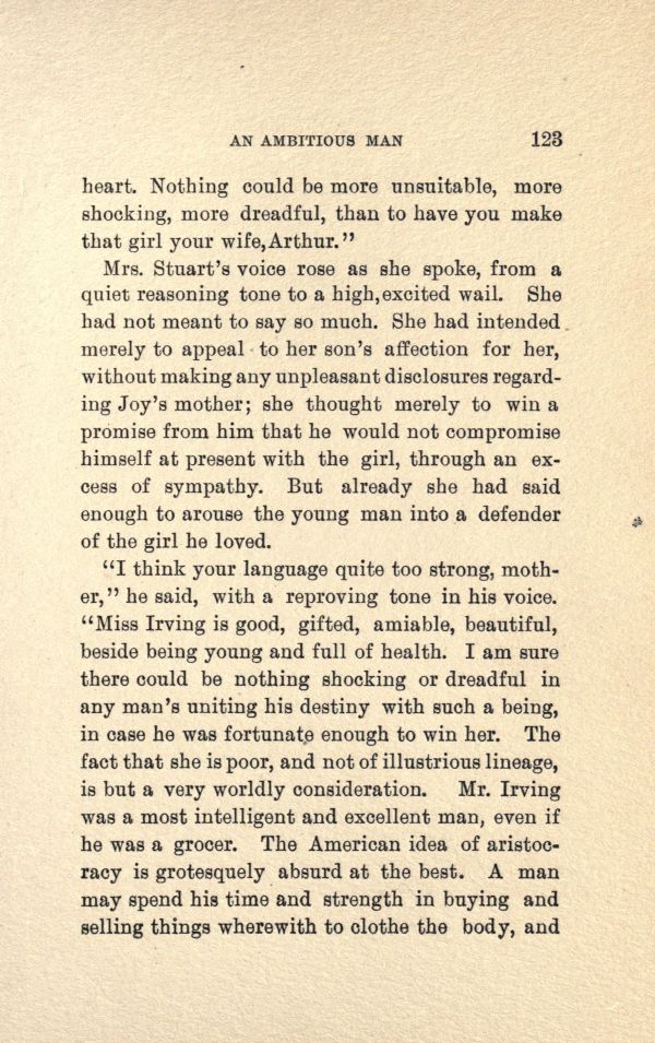 "I think your language quite too strong, mother," be said, with a reproving tone in his voice. "Miss Irving is good, gifted, amiable, beautiful, beside being young and full of health. I am sure there could be nothing shocking or dreadful in any man's uniting his destiny with such a being, in case be was fortunate enough to win her. The fact that she is poor, and not of illustrious lineage, is but a very worldly consideration. Mr. Irving was a most intelligent and excellent man, even if he was a grocer. The American idea of aristocracy is grotesquely absurd at the best. A man may spend his time and strength in buying and selling things wherewith to clothe the body, and