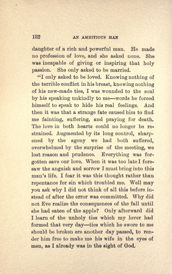 "I only asked to be loved. Knowing nothing of the terrible conflict in his breast, knowing nothing of his new-made ties, I was wounded to the soul by his speaking unkindly to me-words be forced himself to speak to. bide his real feelings. And then it was that a strange fate caused him to find me fainting, suffering, and praying for death. The love in both hearts could no longer be restrained. Augmented by its long control, sharpened by the agony we had both suffered, overwhelmed by the surprise of the meeting, we lost reason and prudence. Everything was forgotten save our love. When it Was too late I fore saw the anguish and sorrow I must bring into this man's life. I fear it was this thought rather than repentance for sin which troubled me. Well may you ask why. I did not think of all this before in stead of after the error was committed. Why did not Eve realize the consequences of the fall until she had eaten of the apple? Only afterward did I learn of the unholy ties which my lover had formed that very day-ties which he swore to me should be broken ere another day passed, to render him free to make me his wife in the eyes of men, as I already was in the sight of God.