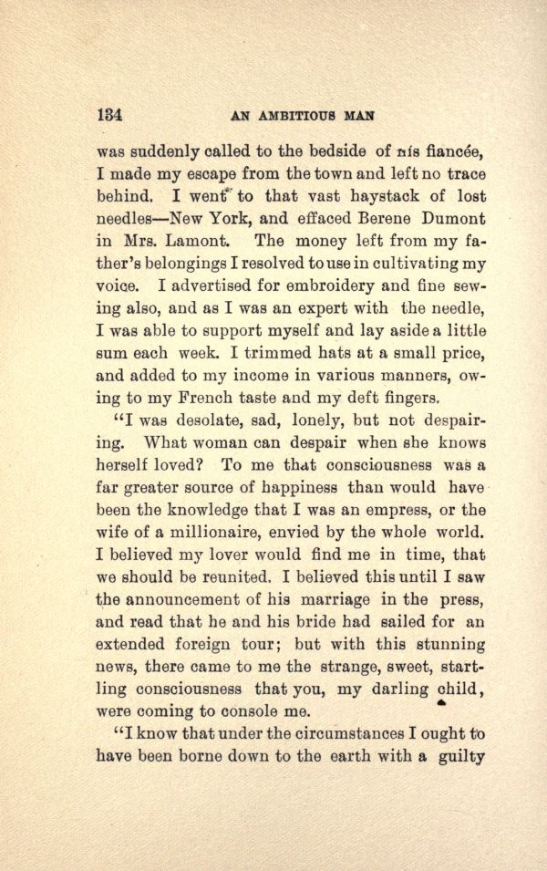 was suddenly called to the bedside of his fiancée, I made my escape from the town and left no trace behind, I went to that vast haystack of lost needles --- New York, and effaced Berene Dumont in Mrs. Lamont. The money left from my father's belongings I resolved to use in cultivating my voice. I advertised for embroidery and fine sewing also, and as I was an expert with the needle, I was able to support myself and lay aside a little sum each week. I trimmed hats at a small price, and added to my income in various manners, owing to my French taste and my deft fingers.
