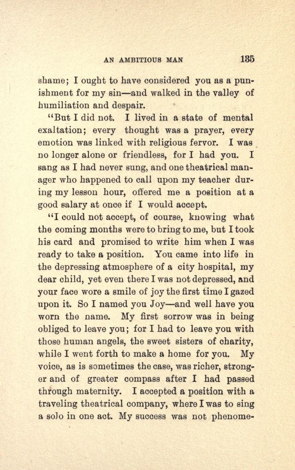 "I could not accept, of course, knowing what the coming months were to bring to me, but I took his card and promised to write him, when I was ready to take a position. You came into life in the depressing atmosphere of a city hospital, my dear child, yet even there I was not depressed, and your face wore a smile of joy the first time I gazed upon it. So I named you Joy-and well have you worn the name. My first sorrow was in being obliged to leave you; for I bad to leave you with those human angels, the sweet sisters of charity, while I went forth to make a home for you. My voice, as is sometimes the case, was richer, stronger and of greater compass after I had passed through maternity. I accepted a position with a traveling theatrical Company, where I was to sing a solo in one act. My success was not phenomenal,