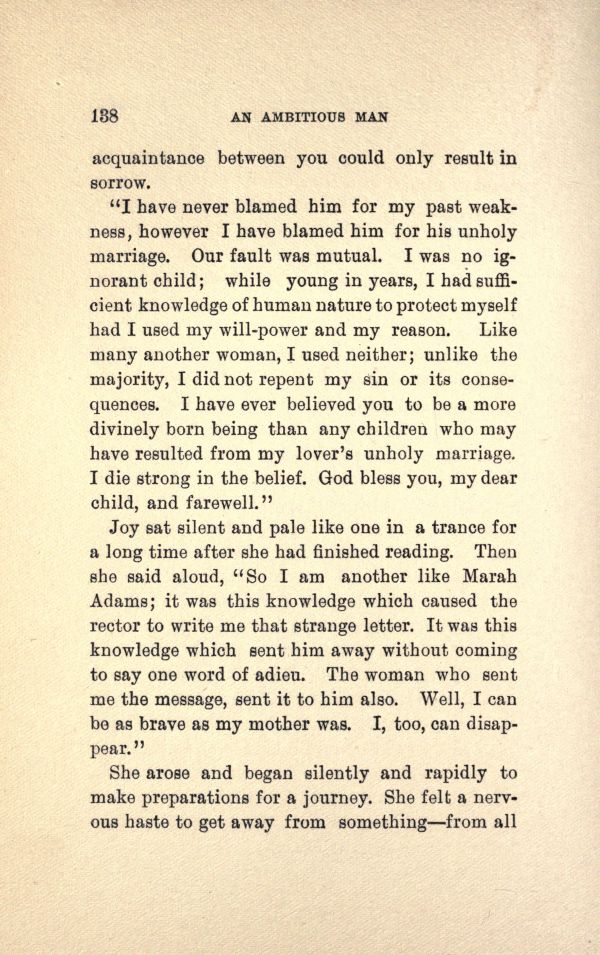 Joy sat silent and pale like one in a trance for a long time after she bad finished reading. Then she said aloud, "So I am another like Marah Adams; it was this knowledge which caused the rector to write me that strange letter. It was this knowledge which sent him away without coming to say one word of adieu. The woman who sent me the message, sent it to him also. Well, I can be as brave as my mother was. I, too, can disappear."