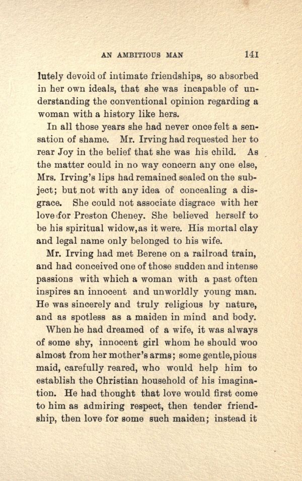 Mr. Irving had met Berene on a railroad train, and had conceived one of those sudden and intense passions with which a woman with a past often inspires an innocent and unworldly young man. He was sincerely and truly religious by nature, and as spotless as a maiden in mind and body.