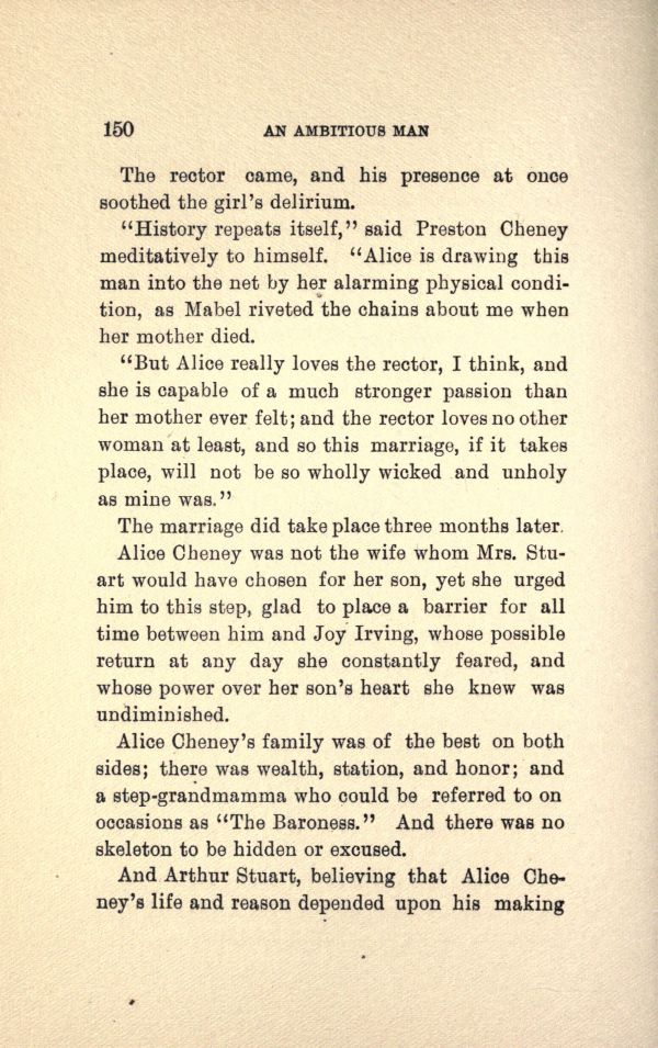 Alice Cheney's family was of the best on both sides; there was wealth, station, and honor; and a step-grandmamma who could be referred to on occasions as "The Baroness." And there was no skeleton to be hidden or excused. And Arthur Stuart, believing that Alice Cheney's life and reason depended upon, his making