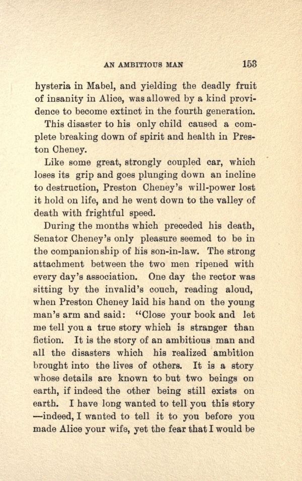 During the months which preceded his death, Senator Cheney's only pleasure seemed to be in the companionship of his son-in-law. The strong attachment between the two men ripened with every day's association. One day the rector was sitting by the invalid's couch, reading aloud, when Preston Cheney laid his band on the young man's arm and said: " Close your book and let me tell you a true story which is stranger than fiction. It is the story Of and all the disasters which his realized ambition brought into the lives of others. It is a story whose details are known to but two beings on earth, if indeed the other being still exists on earth. I have long wanted to tell you this story 'indeed, I wanted to tell it to you before you made Alice your wife, yet the fear that I would be