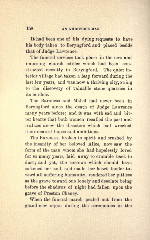 The funeral services took place in the new and imposing church edifice which had been constructed recently in Beryngford. The quiet interior village bad taken a leap forward during the last few years, and was now a thriving city, owing to the discovery of valuable stone quarries in its borders.