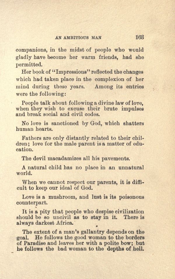 Her book of "Impressions" reflected the changes which had taken place in the complexion of her mind during these years. Among its entries were the following: