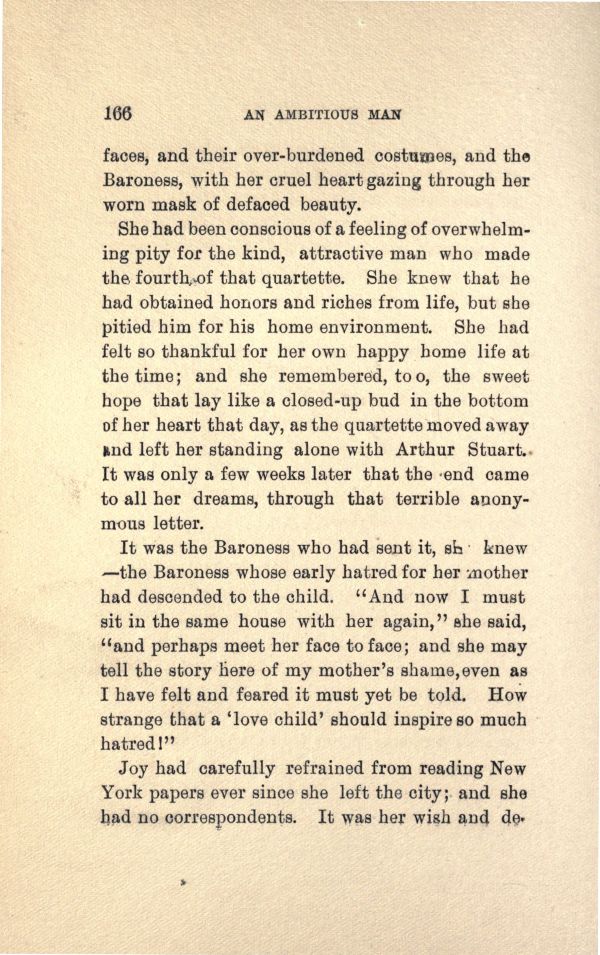 It was the Baroness who had sent it, she knew 'the Baroness whose early hatred for her mother had descended to the child. "And now I must sit in the same house with her again," she said, "and perhaps meet her face to face; and she may tell the story here of my mother's shame, even as I have felt and feared it must yet be told. How strange that a --- love child --- should inspire so much hatred!"