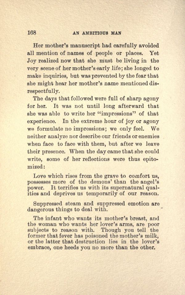 Her mother's manuscript had carefully avoided all mention of names of people or places. Yet Joy realized now that she must be living in the very scene of her mother's early life; she longed to make inquiries, but was prevented by the fear that she might bear her mother's name mentioned disrespectfully.