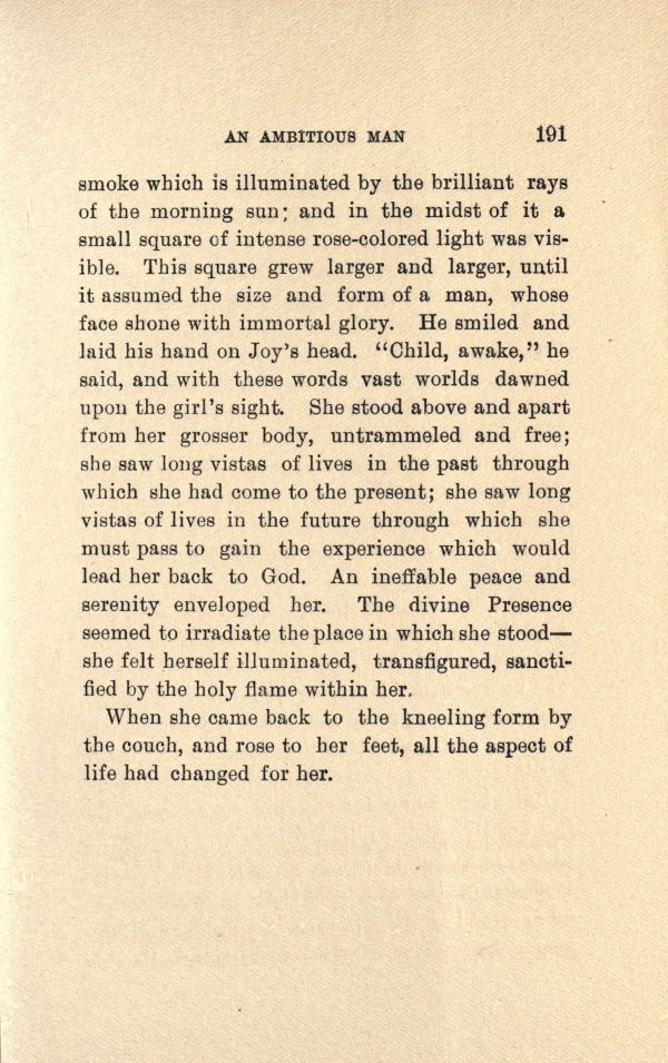 smoke which is illuminated by the brilliant rays of the morning sun; and in the midst of it a small square of intense rose-colored light was visible. This square grew larger and larger, until it assumed the size and form of a man, whose face shone with immortal glory. He smiled and laid his band on Joy's head. " Child, awake," he said, and with these words vast worlds dawned upon the girl's sight. She stood above and apart from her grosser body, untrammeled and free; she saw long vistas of lives in the past through which she had come to the present; she saw long vistas of lives in the future through which she must pass to gain the experience which would lead her back to God. An ineffable peace and serenity enveloped her. The divine Presence seemed to irradiate the place in which she stood' she felt herself illuminated, transfigured, sanctified by the holy flame within her.