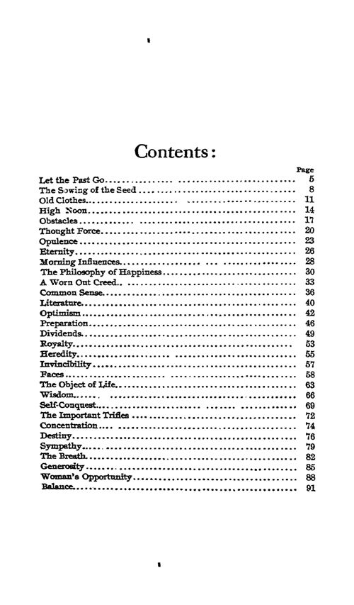 Publisher's Preface - Let The Past Go - The Sowing of the Seed - Old Clothes - High Noon - Obstacles - Thought Force - Opulence - Eternity - Morning Influences - The Philosophy of Happiness - A Worn Out Creed - Common Sense - Literature - Optimism - Preparation - Dividends - Royalty - Heredity - Invincibility - That Mental Chisel - The Object of Life - Wisdom - Self Conquest - The Important Trifles - Concentration - Destiny - Sympathy - The Breath - Generosity - Woman's Opportunity - Balance - Contents