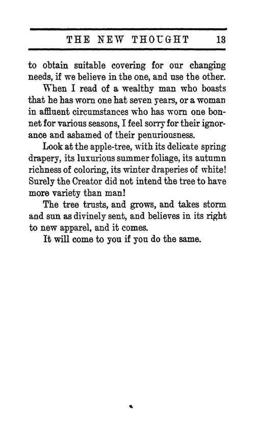 Look at the apple tree, with its delicate spring drapery, its luxurious summer foliage, its autumn richness of coloring, its winter draperies of white! Surely the Creator did not intend the tree to have more variety than man!