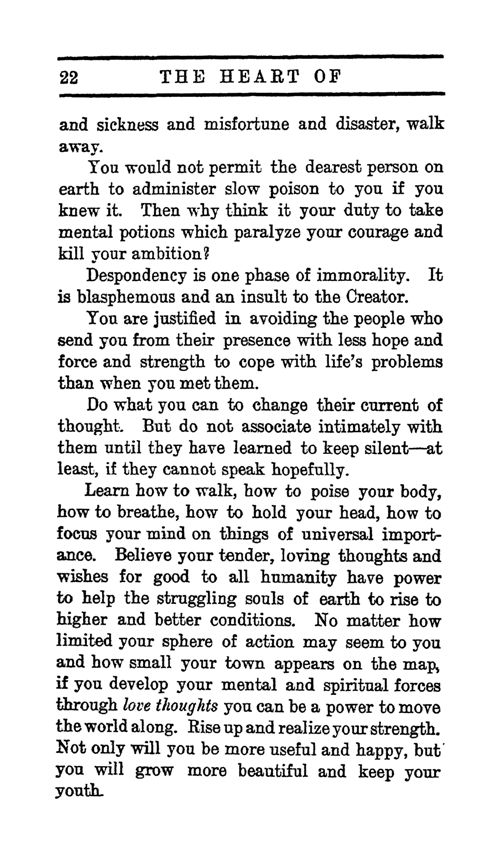 Learn how to walk, how to poise your body, how to breathe, how to hold your head, how to focus your mind on things of universal importance. Believe your tender, loving thoughts and wishes for good to all humanity have power to help the struggling souls of earth to rise to higher and better conditions. No matter how limited your sphere of action may seem to you and how small your town appears on the map, if you develop your mental and spiritual forces through love thoughts you can be a power to move the world along. Rise up and realize your strength. Not only will you be more useful and happy, but you will grow more beautiful and keep your youth.