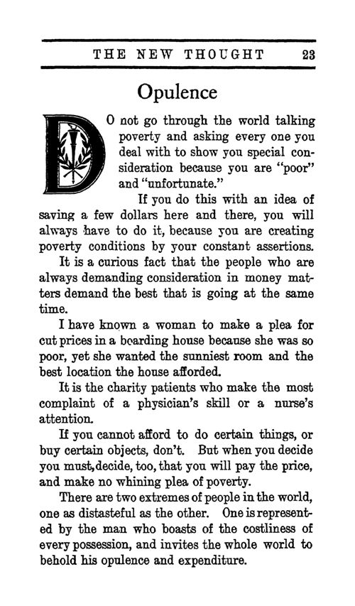 Publisher's Preface - Let The Past Go - The Sowing of the Seed - Old Clothes - High Noon - Obstacles - Thought Force - Opulence - Eternity - Morning Influences - The Philosophy of Happiness - A Worn Out Creed - Common Sense - Literature - Optimism - Preparation - Dividends - Royalty - Heredity - Invincibility - That Mental Chisel - The Object of Life - Wisdom - Self Conquest - The Important Trifles - Concentration - Destiny - Sympathy - The Breath - Generosity - Woman's Opportunity - Balance - Contents