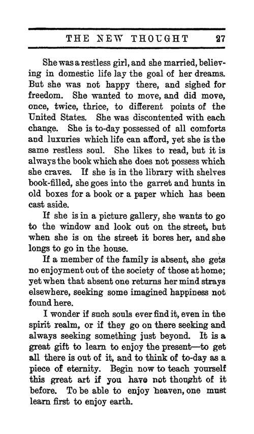 If a member of the family is absent, she gets no enjoyment out of the society of those at home; yet when that absent one returns her mind strays elsewhere, seeking some imagined happiness not found here.