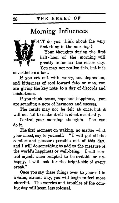 If you set out with worry, and depression, and bitterness of soul toward fate or man, you are giving the keynote to a day of discords and misfortunes.