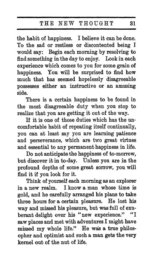 Think of yourself each morning as an explorer in a new realm. I know a man whose time is gold, and he carefully arranged his plans to take three hours for a certain pleasure. He lost his way and missed his pleasure, but was full of exuberant delight over his "new experience." "I saw places and met with adventures I might have missed my whole life." He was a true philosopher and optimist and such a man gets the very kernel out of the nut of life.
