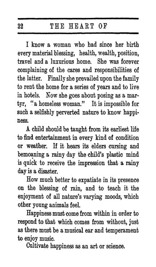 I know a woman who had since her birth every material blessing, health, wealth, position, travel and a luxurious home. She was forever complaining of the cares and responsibilities of the latter. Finally she prevailed upon the family to rent the home for a series of years and to live in hotels. Now she goes about posing as a martyr, "a homeless woman." It is impossible for such a selfishly perverted nature to know happiness.